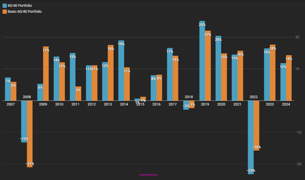Below we compare the 60/40 Portfolio (SPY/TLT) to the Basic 60/40 Portfolio (SPY/AGG).