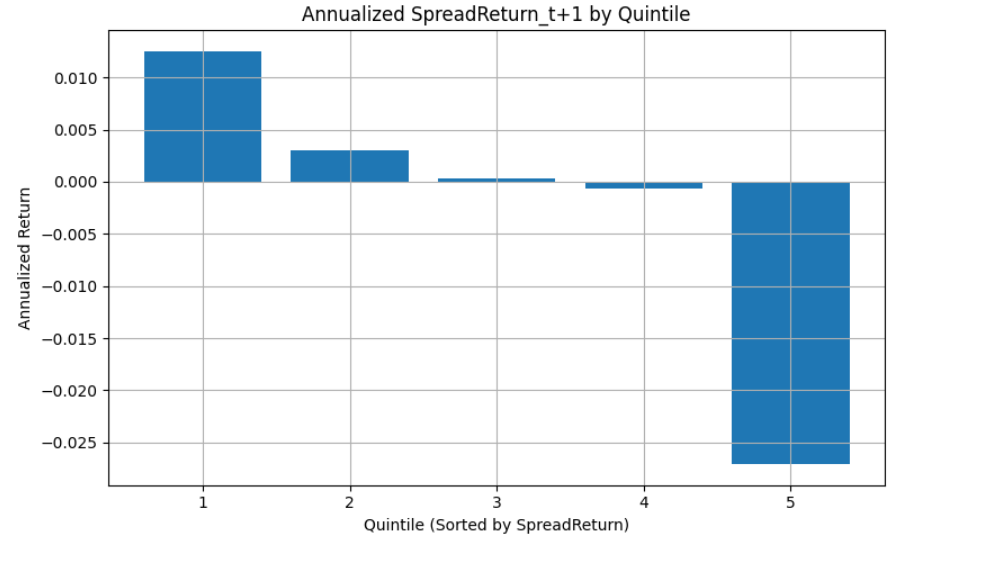 3. Grouped them into five equal-sized portfolios, from the most negative to the most positive spread return.
